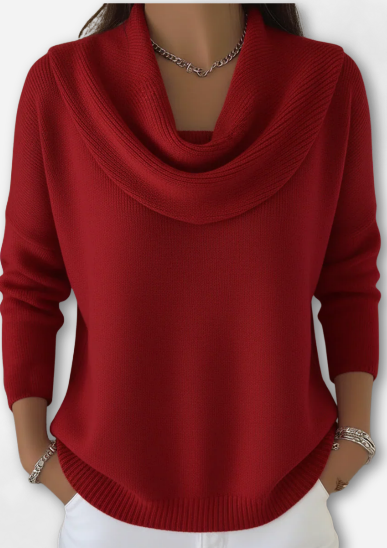 Este suéter aporta un toque pulido a tu look diario. Con un escote drapeado y una silueta relajada, es perfecto para superponer en días más frescos o para vestir salidas casuales.