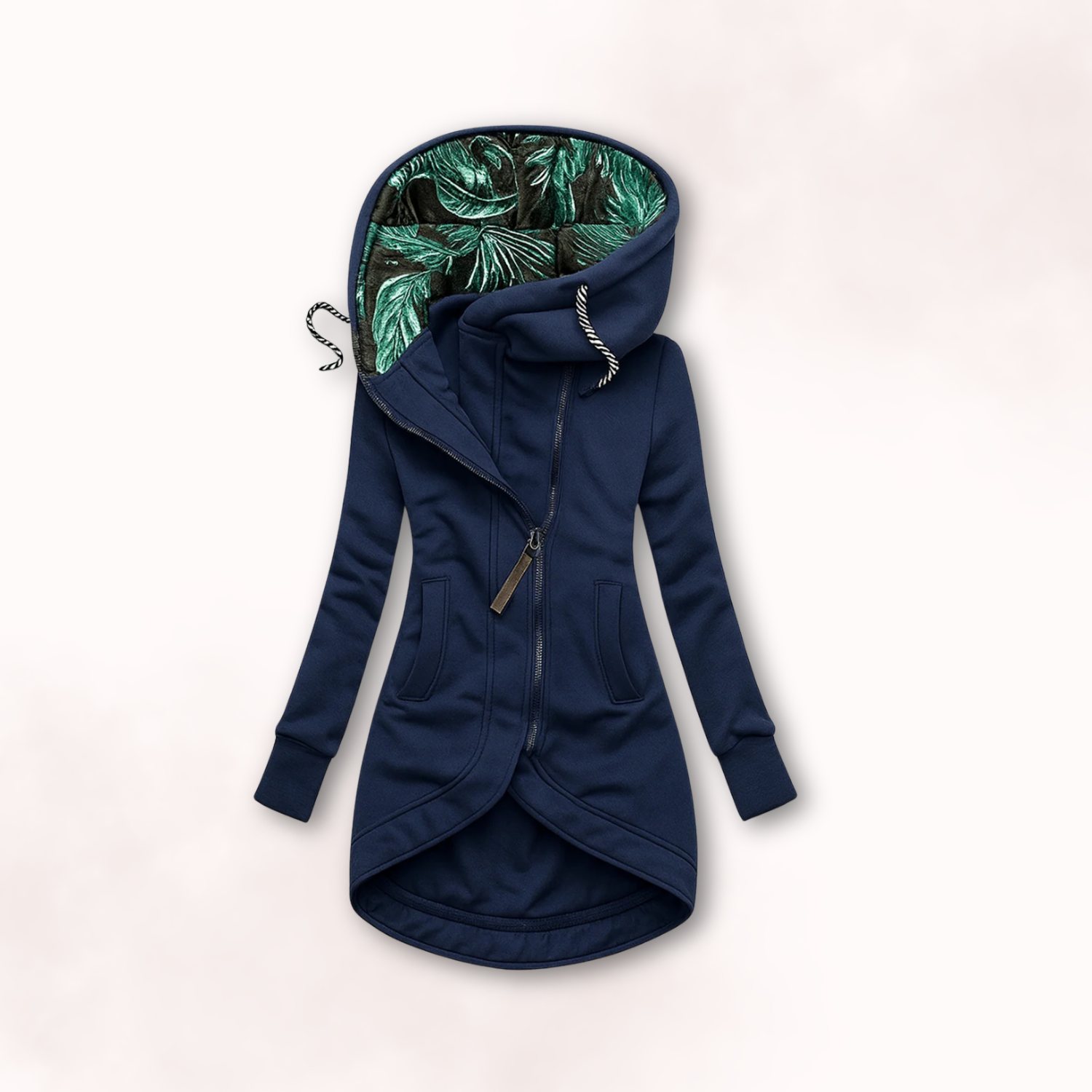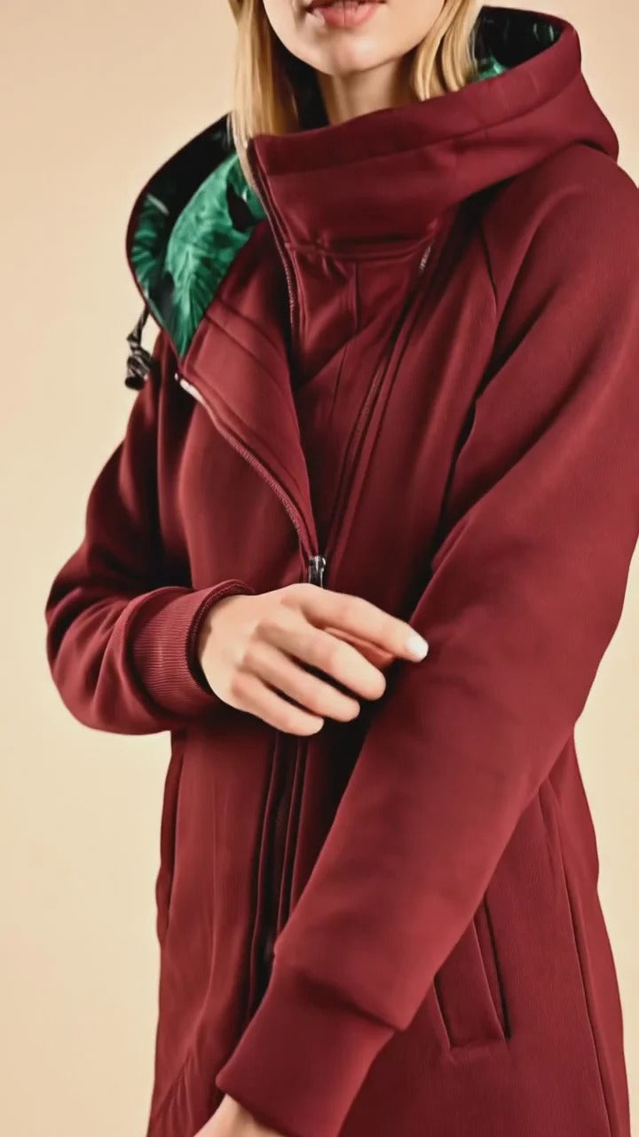 El abrigo con capucha NUA de invierno combina estilo casual y confort absoluto. Confeccionado en tejido técnico de mezcla algodón y poliéster premium, ofrece una textura suave, cálida y resistente al desgaste. Su diseño largo con corte curvado frontal estiliza la figura, mientras que la capucha interior estampada y los cordones contrastados añaden un toque moderno. Perfecto para los días fríos en los que buscas abrigo sin perder estilo.
