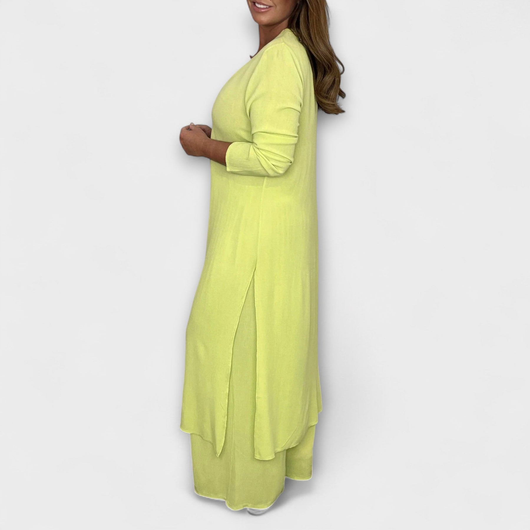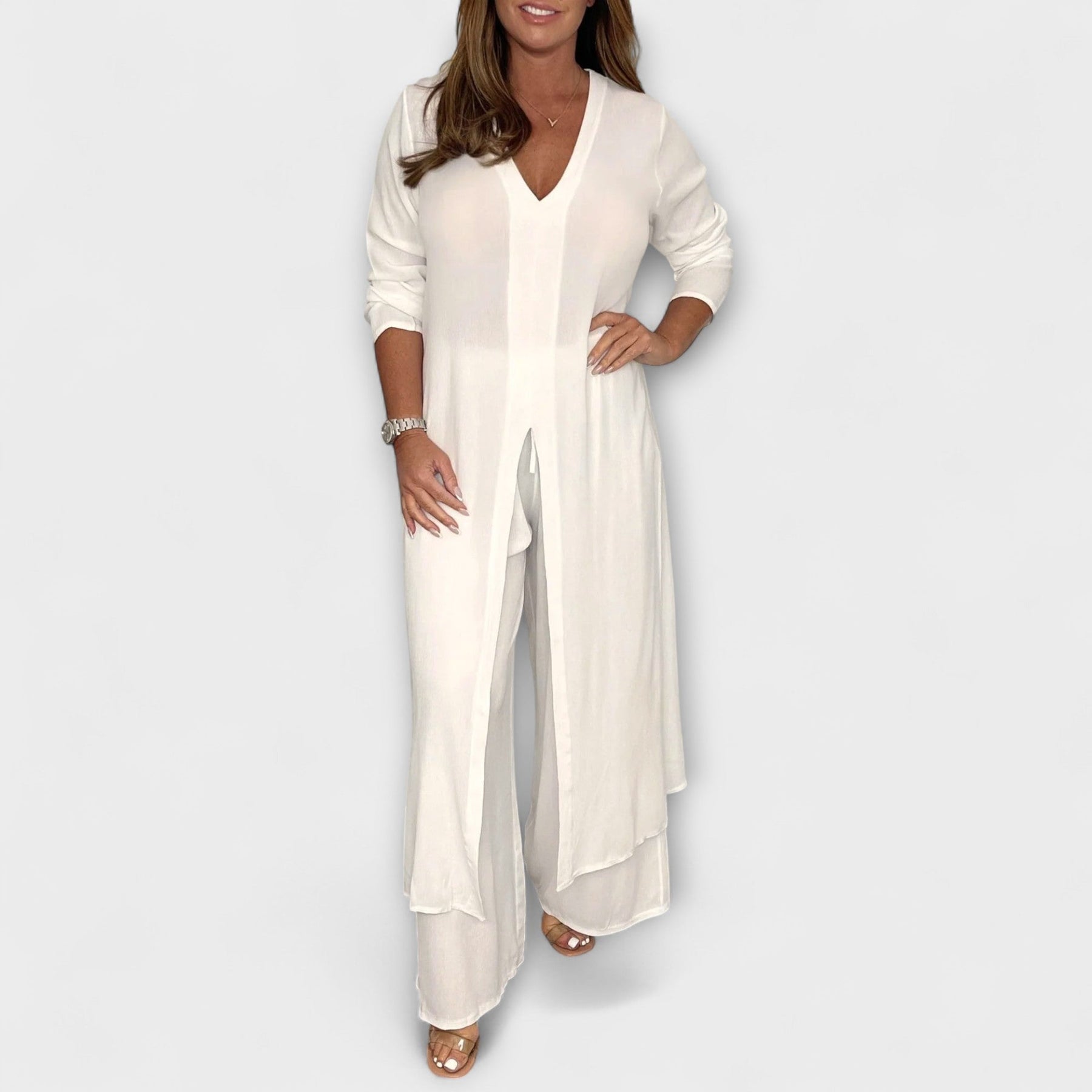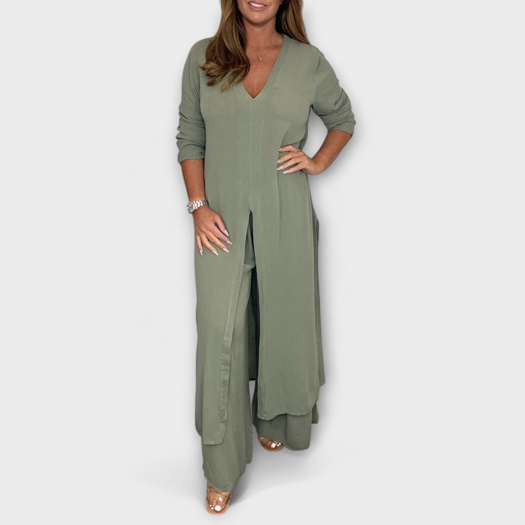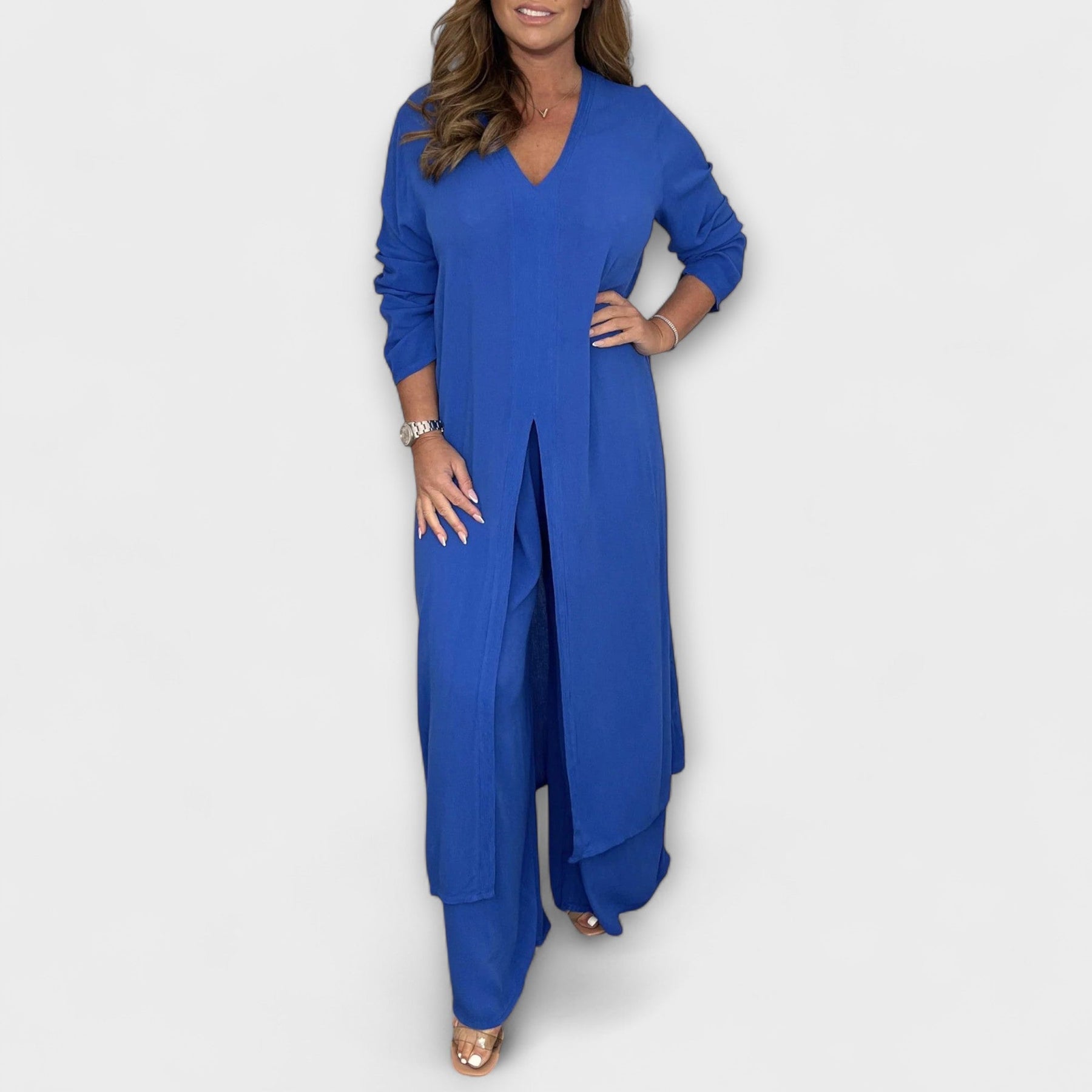 El conjunto de verano Neve combina elegancia estilosa con el máximo confort. La blusa fluida con escote en V y finas mangas aporta un look femenino, mientras que los pantalones holgados con cintura elástica realzan tu figura de manera favorecedora, sin apretar.